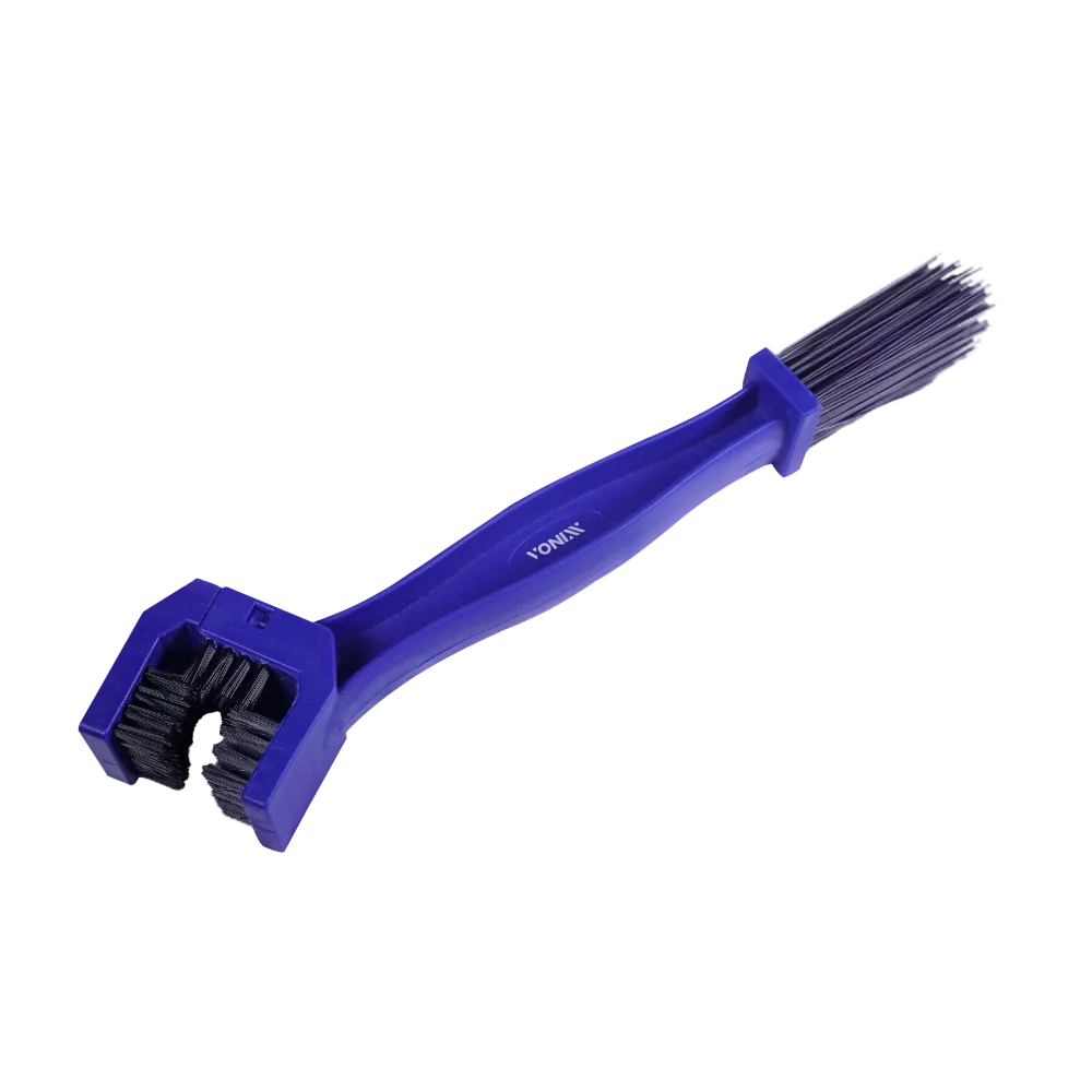 Cerdas de nylon com suporte em polipropileno com formato anatômico que facilita na limpeza de corrente de transmissão de motocicleta.